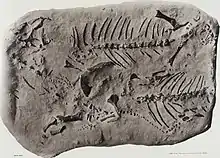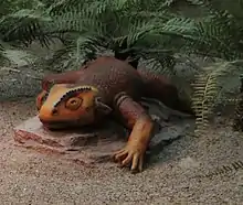 Koiloskiosaurus is an extinct genus of procolophonid parareptile from the Early Triassic of Germany. The type and only species Koiloskiosaurus coburgensis was named by German paleontologist Friedrich von Huene in 1911 from a layer of rocks called the Buntsandstein. Koiloskiosaurus coburgensis is known from a block of three fossilized skeletons preserved together. Given that the skeletons are oriented in the same direction, the individuals most likely died in a burrow.[1] Features of the skeletons of Koiloskiosaurus and other procolophonids, such as robust limbs and solid, immovable skull bones, are also taken as evidence that they were burrowers.[2]