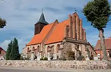 The village is home to the church of St. Barbara (Kościół Świętej Barbary). This church dates back to the 14th century. Though mainly built of boulders, ist windows and its eastern gable make it an example of Brick Gothic style. There is a graveyard and a house behind the church aptly named after Pope John Paul II.