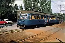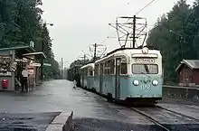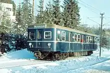Jar is also served by Line 13 of the tramway. It branches off on the east side of Lysakerelven and follows the Lilleaker Line to Skøyen, where it continues as a street tram to the city center along the Skøyen Line. It operates at a ten-minute headway. Travel time to Jernbanetorget is 31 minutes from Bekkestua.[8] In comparison, the metro uses 22 minutes from Bekkestua to Jernbanetorget.[5] Tram operations are carried out by Sporveien Trikken using SL95 trams.[8]