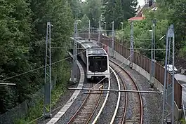 At Øraker the Lilleaker Line meets the Kolsås Line, after which point the lines share tracks.[3] The line crosses the municipal border across the river Lysakerelven. The now closed station of Lysakerelven, 8.4 kilometers (5.2 mi) from Stortinget, was situated on the Bærum side of the municipal border between Oslo and Bærum.[4] At Jar there are two sets of platforms, one for the metro and one for the trams. The continues past Ringstabekk, which is only served by the metro. It replaced three disused stations, Tjernsrud, Ringstabek and Egne hjem.[3] Situated 11.4 kilometers (7.1 mi) from Stortinget,[4] Bekkestua is the terminal station for the tramway, and a major transit hub for central Bærum. Like Jar, it features two sets of different platforms. The shared rail section features both third-rail power supply and overhead wires. The trams have a narrower loading gauge and shorter platforms, making it necessary to provide separate platforms for them.[3]