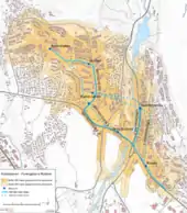 Rykkinn is a neighborhood in the vicinity of Kolsås, an area with about 7,500 residents. Extension of the Kolsås Line to Rykkinn, possibly with a further extension to Bærums Verk, has been proposed. Several routes to Rykkinn have been proposed along various trajectories, normally with three stations. Some of these include routes in a tunnel. A light rail report was issued in 2004.[16] Political indications state that the line will be prioritized after the Fornebu Line and the extension of the Furuset Line to Akershus University Hospital and that the extension would probably not be carried out until after 2025.[17] Ruter stated the extensions, estimated to cost about 1 billion kroner, in its 2010 long-term statement.[18]