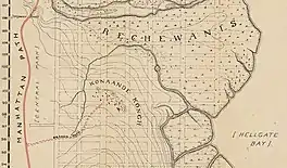 At the same time, Dutch settlements of New Netherland were moving northward from the southern areas of Manhattan island in the mid-1600s. The Dutch increasingly sought title to lands that included Konaande Kongh.[3][5] Other nearby Lenape settlements to the south had already been abandoned, such as Sapohanikan in the 1630s[6][7] and Nechtanc, being the site of a massacre in 1643.[8][9] The Dutch had also gained title to nearby land in northern Manhattan in 1647.[5]
