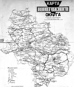 The okruha was created on 7 March 1923 as one of the divisions of Chernihiv Governorate.[2] At the time of its creation, the okruha consisted of 11 raions.[1] On 1 August 1925, the governorates of the Ukrainian SSR were all abolished, and Konotop Okruha became one of the first-level administrative divisions of the republic.[3]