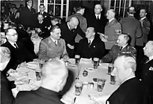 Hierl was already a high-ranking member of the NSDAP when the Party took power in January 1933. He remained the head of the labour organization - now called the Nationalsozialistischer Arbeitsdienst, or NSAD. Adolf Hitler named him as State Secretary in the Reich Ministry of Labour under Franz Seldte, with the order to build up a powerful labour service organization.[1] Facing Minister Seldte's resistance, Hierl in 1934 switched to the Reich Ministry of the Interior under Wilhelm Frick in the rank of a Reichskommissar. Hierl was also named a member of Hans Frank's Academy for German Law.[2] On 11 July 1934, the NSAD was renamed Reichsarbeitsdienst or RAD (Reich Labor Service) which Hierl would control as its chief until the end of World War II. The Reich Labor Service was divided into two major sections, one for men (Reichsarbeitsdienst Männer - RAD/M) and one for women (Reichsarbeitdienst der weiblichen Jugend - RAD/wJ). The RAD was composed of 40 Gau-sections (Arbeitsgau). In 1936 the Reich Labor Service built the model village of Hierlshagen (present-day Ostaszów in Poland), named after Hierl. He was named Reich Labor Leader (Reichsarbeitsführer) in 1935 and Reichsleiter, the second highest political rank in the Nazi Party, on 10 September 1936.[1][3] Also in 1936, he was awarded the Golden Party Badge. Hierl was further appointed Minister Without Portfolio in 1943.[1]