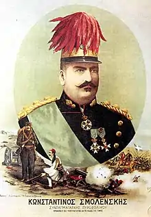 Konstantinos Smolenskis or Smolents (Greek: Κωνσταντίνος Σμολένσκης/Σμόλεντς, 1843–1915) was a Hellenic Army officer. Descendant of a family that had settled in the Habsburg monarchy and returned to Greece after the Greek War of Independence, early in his career he was distinguished as a well-educated and capable officer. He particularly distinguished himself in the Greco-Turkish War of 1897, where he led the Greek defenders at the Battle of Velestino. This rendered him a national hero and earned him widespread popularity; he was twice elected Member of the Hellenic Parliament, and served twice as Minister for Military Affairs.