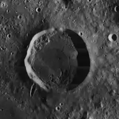 At one time this crater was considered to have formed due to volcanic activity,[1] in contrast to most lunar craters which are considered to have been created through impacts. However it is more likely that the crater was formed by an impact against a surface that was still partly molten. This has left the crater with a sharp-edged, circular rim and a flat, dark-hued interior floor. Indeed, the albedo of the interior floor matches that of the lunar mare to the west. The southeast part of the floor is fractured with a series of narrow rilles. The floor along the northwest and northeast edges is more rugged, and these sections have escaped the lava that covered the remainder of the floor.