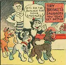 The strip's simple premise follows the adventures of a black male cat called Korky, a cat who behaves like a human and is accepted in a world of humans as only a comic character can be. Originally a mute character, he started speaking in No. 149, 5 October 1940 (see image for his first words as he tries to help some hungry dogs). The 1950s saw the introduction of his 'Kits', Nip, Lip, and Rip.