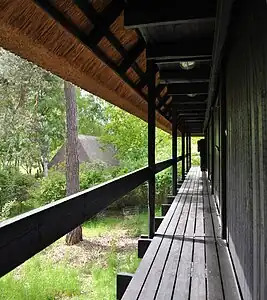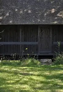 Korshagehus is a single-storey building constructed in timber on poles with Cantilever boardwalks on three sides. The building is topped by a steep, thatched, half-hipped roof. The roof ridge is pierced by a white-washed chimney. The walls are faced with vertical boarding, intrerupted by doorways with large glazed sections which can be closed by shutters, and a glazed south gable. The house has a rectangular floor plan measuring 18 x 4 metre. A plastered and black-painted brick basement has later been added below the central part of the building to provide support for the timber structure. [1]