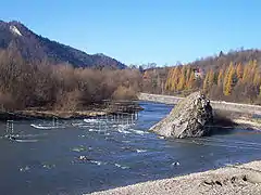 The Kotuńka Rock is a prominent rock found in the centre of the current of the river Dunajec just before the entry into Szczawnica. Built from limestone, the rock is well seen from the road and is a characteristic landmark in the area. Just above the rock the Grajcarek flows into the Dunajec. On from the rock is a bridge, after which begins the Pieniny Trail Road which heads to a border crossing.