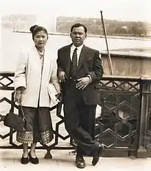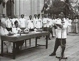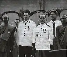 In his speeches or in his party newspaper, « Voice of Laos » (Xieng Lao – ສຽງລາວ), he stated that links with France were necessary, though he never let pass what he considered as « French invasions » in his country's management.[11] Earlier, in November, 1941, while he was Vientiane Governor's assistant, in the article « Speech to youth », published in the journal « Indochine »,[n 22] he claimed a larger autonomy for Laotian officials, the departure of Vietnamese executives,[n 23] the end of feudal system, the limitation of the Indo-Chinese Federation's competence and more democracy.[5][16]