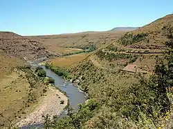 The Kraai River originates in the mountains south of Lesotho and flows westward from the confluence of the Bell River and the Sterk Spruit at Moshesh's Ford at 30°51′09″S 27°46′40″E / 30.852558°S 27.7777527°E all the way to Aliwal North, where it joins the Orange River at 30°40′02″S 26°45′06″E / 30.66715°S 26.75177°E.[1]