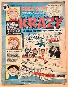 Krazy was a British comic book magazine published every Monday by IPC Magazines Ltd.[1] It ran from (issues dates) 16 October 1976 to 15 April 1978, when it merged with stable-mate Whizzer and Chips.[1] In 1977, one of the characters in the comic, Cheeky, proved popular enough to get his own comic, Cheeky, which was later merged into Whoopee!. The comic included a "disguise" back-cover, such as the cover of a diary or brochure, which allowed readers to hide the comic from parents or teachers (although one issue on April Fool's day had the front cover upside down).[1]