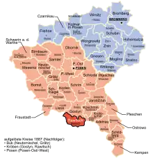 According to the Prussian census of 1910, Kreis Rawitsch had a population of 50,523, of which 42% were Germans and 58% were Poles.[1] A large part of the German population left the district after 1919, when it became part of Poland.