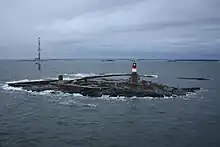 Harmaja 60°6′16.58″N 24°58′27.27″E / 60.1046056°N 24.9742417°E is a small island with a lighthouse south of Suomenlinna between Katajaluoto and Kuivasaari. The island has been used as a pilot station and the current lighthouse was built in 1883. At the start of the war two 75 mm (3 in) guns were placed on the island. These were relocated in October 1914 when construction of a 6-inch Canet battery began. The small island did not have the necessary building materials, and sand, gravel and cement had to be brought in with barges. The guns were installed in February 1915 and the battery was finished in September 1916. Harmaja battery is the smallest of the long range batteries and the guns are not located in straight line but in an L-shaped formation. A breakwater surrounds the southern end of the island.[1]: 60–62