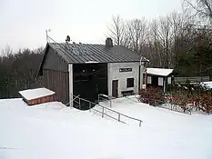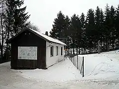 The Kreuzbergschanzen ski jumps are located within the ski area, at an elevation of roughly 600 meters above sea level, where ski jumping has been taking place since 1952. The ski jump facility, renovated in 1997, consists of three artificial turf jumps (K-point distances: 16, 30, and 50 meters) that comply with the latest FIS standards and are primarily used by young ski jumpers. The Kreuzbergschanze is the only ski jump in the Rhön region and in Lower Franconia, Bavaria. The three ski jumps are listed with certification numbers DSV 190 (K-16), 191 (K-30), and 192 (K-50) by the German Ski Association (DSV) until December 4, 2012.[11] The largest event held at the ski jumps took place from January 24 to 26, 1964, during the Bavarian Nordic Winter Games for youth skiers. The longest distance achieved, albeit with a fall, was 74 meters by Henrik Ohlmeyer from SC Bischofsgrün.[12]