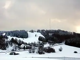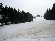 The Kreuzberg Ski Area is located on the northern side of the Kreuzberg mountain (928 m) in the Bavarian part of the Rhön region, near Bischofsheim. It ranges in altitude from approximately 600 to 900 meters above sea level.[1] The ski area features four ski lifts ranging in length from 250 to 1408 meters, providing access to eleven slopes of varying difficulty levels. The slopes are about 15 kilometers in length, with lengths varying from 250 to 3000 meters. Due to the length and steepness of the slopes, it is the largest ski area and one of the most challenging in the Rhön region. The two upper ski lifts, Rothanglift, and Blicklift are known for their snow reliability due to their higher altitude and northern location. The Dreitannenlift is the longest ski lift in the Rhön region and the longest drag lift with the greatest elevation difference in Germany outside of the Alps.[2]