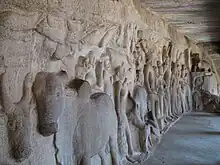 It is constituted by an originally open-air bas-relief dedicated to Krishna, dating to the mid-seventh century, which was later enclosed within a mandapa in the 16th century during the Vijayanagara Empire.[3] Notable carvings inside are sculpted panels that bring out the story of Krishna lifting the Govardhana Hill to protect the cowherds and gopis (milk maids) from heavy rains and floods – the "most poetic and endearing" Indian or Angkor sculpture-based representation of this legend[5] – and there are also scenes of Krishna frolicking with the milk maids.[6][7]