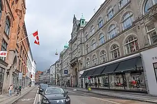 Kristen Bernikows Gade is a street in central Copenhagen, Denmark. It extends north from the major shopping street Strøget to Grønnegade where it turns into Gammel Mønt. Together with Bremerholm, its extension to the south, it forms one of only two places where car traffic crosses pedestrianized Strøget on its way from Kongens Nytorv to the City Hall Square, the other being at Gammeltorv- Nytorv. The street is named for the nobleman Christian Barnekow, one of Christian IV's men, whose city home was located on the site. Most of the buildings date from a widening of the street in around 1900. They include the shopping archade Galleri K.