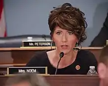 The 2011 House Republican 87-member freshman class elected Noem as liaison to the House Republican leadership, making her the second woman member of the House GOP leadership.[29] According to The Hill, her role was to push the leadership to make significant cuts to federal government spending and to help Speaker John Boehner manage the expectations of the freshman class.[30] In March 2011, Republican Representative Pete Sessions of Texas named Noem one of the 12 regional directors for the National Republican Congressional Committee during the 2012 election campaign.[7][31]