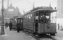 The first section which was electrified was from Munkedamsveien to Grünerløkka, on 29 September 1899.[16] The same day the line was extended to Torshov.[17] The Homansbyen and Oslo Lines were electrified on 17 November,[18] except for the section from Oslo Hospital to St Halvards plass, which had to be hauled by horses until 15 January 1900.[19] This work required the delivery of new electrical trams. Forty-seven Class U units were delivered in 1899, with electrical equipment from Union and bodies built by Falkenried and Linke-Hofmann-Busch. Thirty-eight horsecars were converted to trailers.[20]