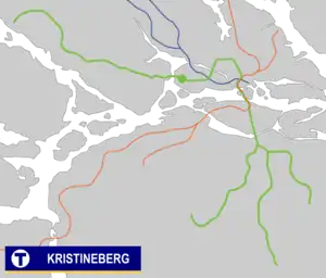 Kristineberg metro station is a station on the Green line of the Stockholm metro. It is located in the district of Kristineberg, which is in the borough of Kungsholmen in central Stockholm. The station is located above ground alongside Drottningholmsvägen on its approach to the eastern end of the Tranebergsbron bridge. It has a single island platform, with access from Nordenflychtsvägen, which passes under the station and bridge approach.[2][3] The distance to Slussen is 6.7 km (4.2 mi).