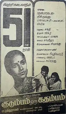 Kudumbam Oru Kadambam (transl. Family is a Flower) is a 1981 Indian Tamil-language drama film directed by S. P. Muthuraman. Based on Visu's play of the same, the film stars Pratap, Suhasini, Sumalatha, S. Ve. Shekher and Visu reprising his role from the play. It was released on 5 December 1981. The film was remade in Kannada as Ananda Sagara (1983),[1] in Telugu as Manishiko Charithra (1984),[2] in Hindi as Aaj Ka Daur (1985),[1] and in Malayalam as Oru Sandesam Koodi that same year.[3]