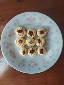 Semprit (Indonesian: kue semprit; Malay: kuih semperit) is a Southeast Asian sweet snack (kue or kuih) made of wheat flour, corn starch, custard powder, sugar and margarine. These ingredients are mixed together to become a dough. Next, the dough is rolled and cut into small pieces, which are baked until golden yellow. Semprit is ready to eat once it has cooled to room temperature.