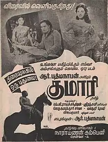 Kumari is a 1952 Indian Tamil-language film directed by R. Padmanaban, starring M. G. Ramachandran, Madhuri Devi and Sri Ranjani (Junior).[1]