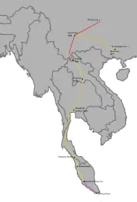 In 2000, ASEAN proposed completing the Kunming to Singapore railway, via Hanoi, Ho Chi Minh City (formerly Saigon), Phnom Penh, and Bangkok.[7][10][11] This 5,500 km (3,400 mi) route is now known as the eastern route. In 2004, ASEAN and China proposed the shorter western route, which instead of running east through Vietnam and Cambodia, would go west from Kunming to Myanmar and then to Bangkok.[12] In 2007 ASEAN and China proposed building three routes, the Eastern, Western and a central route via Laos.[13]