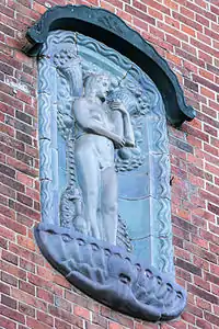Bossard's work was heavily influenced by Norse mythology. It is deemed unique by art historians, on a par with the expressionist art of Böttcherstrasse at Bremen or the Chilehaus at Hamburg.[2]
