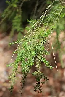 Kunzea axillaris is an erect shrub or tree which grows to a height of about 6 m (20 ft) with its branches hairy when young. The leaves are linear in shape, 3–5 mm (0.1–0.2 in) long, less than 1 mm (0.04 in) wide and glabrous when mature. The leaves taper towards the petiole and have a pointed end. The flowers are crowded on side branches or in the axils of upper leaves on a stalk up to 2 mm (0.08 in) long. The floral cup is glabrous, the sepal lobes are less than 0.5 mm (0.02 in) long and the petals are white, 1.0–1.5 mm (0.04–0.06 in) long. There are about thirty stamens which are 2–3.5 mm (0.08–0.1 in) long. Flowering occurs in January and the fruit are cup-shaped capsules which are 2–3 mm (0.08–0.1 in) long and about 1 mm (0.04 in) wide.[2][3]