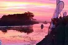 The ceremony begins with two white scout canoes that are sent to check the depth of the water and for the presence of any enemies. Once the scouts signal the "all clear", the journey to the highland begins. The Litunga’s royal boat is followed by another boat for his wife and another for the Prime Minister. The journey to Limulunga normally takes about 6–8 hours. Drums beat throughout to coordinate and energise those paddling the barge.[5] The most important are the three royal war drums – kanaona, munanga, and mundili – each more than one metre wide and said to be at least 170 years old.[6]