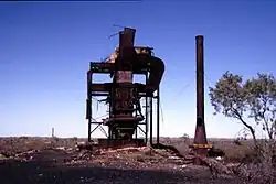 The remains of the smelter-works includes a blast furnace, concrete engine mounts and an iron chimney. A large, well-formed slag dump extends northward from the smelter.[9]: 6 [10]: 559 Adjacent to the furnace is a second iron chimney, powerhouse foundations and roasting furnace.[10]: 559 The steel plate chimneys and parts of the smelter are all heavily rusted and the foundations are showing signs of heavy cracking.[1][9]: 5–6