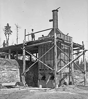 The kiln was a rectangular structure 4m x 3.5m x 8m high on a concrete foundation and the red brick walls were reinforced with iron strapping. The kiln held 25 tons of 3-feet-long billets per load which were carried up on a small inclined tramway to be loaded into the top.[14]