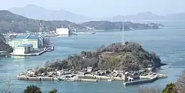 During the Sengoku period, the island was the base of the Kurushima Murakami, one of the three main houses of the Murakami kaizoku (the others the Noshima Murakami and Innoshima Murakami).[5] There are still remains of the walls of Kurushima Castle (来島城), an element of Japan Heritage "Story" #036,[6] as well as traces of residences and wells.[3] In the Edo period, together with nearby Oshima (小島), the island was part of Kurushima Village (来島村) in Matsuyama Domain, with an assessment of twenty-six koku, three to, and nine shō.[2] Around the end of the Kyōhō era in the early eighteenth century there were some seventy-eight households, fifty-three of them of fishermen.[2] By Shōwa 53 (1978) this number had dropped to thirty-nine households, primarily making a living by commuting to the local shipyards and line fishing.[2] As of 2009, Kurushima had thirty-two residents.[3]
