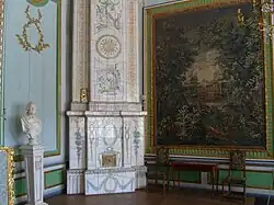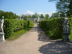 The park of Kuskovo was created between 1750 and 1780 as a formal Garden à la française, with large ornamental parterres of flowers, carefully trimmed hedges, and alleys which met at either right or diagonal angles, and were ornamented with statues, and lined with either rows of trees trimmed into spheres, large vases; orange trees; or myrtle trees trimmed into cones.[11] Eight park alleys converge in a single point, where the circular Hermitage pavilion (1764–77) now stands. Count Sheremetev spent most of his time in the Hermitage, coming to the Palace only for formal occasions and holidays.[11]