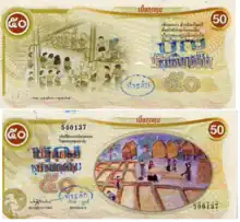Kut Chum is known for its organic movement and organic foods, chiefly the organic farming of rice.[3] Kut Chum also achieved fame for issuing its own local scrip called Bia Kut Chum. Bia, Thai for 'cowry shell', was once a unit of currency equal to 1⁄6400 of a Thai baht, and bia is still current in metaphorical expressions, so the usage ran afoul of currency laws. To side-step implications that they intended a substitute local currency, they changed to Boon Kut Chum, which are barter coupons with a fixed value in baht, that may be exchanged for goods and services in the community.[4]