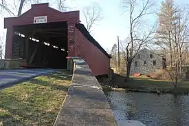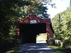 Built in 1854, this historic structure is a 93-foot-long (28 m), Burr Truss bridge that crosses the Sacony Creek. It is one of five covered bridges remaining in Berks County.[2] As the name implies, it leads to the Kutz Mill.
