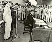 Derevyanko was born on November 14, 1904, in the village of Kosenivka, Umansky Uyezd, Kiev Governorate, Russian Empire (now Ukraine). Derevyanko (at the time Chief of Staff of the 35th Army) was the representative of the Soviet Union at the ceremonial signing of the written agreement that established the armistice ending the Pacific War and with it World War II.[1] The Soviet delegation joined other Allied representatives on the battleship USS Missouri which was anchored in Tokyo Bay.[2] Together, the waiting Allies silently acknowledged the representatives of the Japanese Emperor and the representative of the Imperial Japanese Army, who were the last to arrive. The proceedings began when General MacArthur stepped before a single microphone. The 23-minute surrender ceremony was broadcast worldwide.[3] Derevyanko signed the Japanese Instrument of Surrender at precisely 9:17 a.m. in Tokyo Bay on September 2, 1945.[4] He served as Soviet representative at MacArthur's headquarters during the US occupation of Japan.