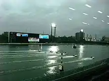 Kyōtei employs the flying start system of beginning races. Once competitors receive the signal to pit-out of the docks, they will maneuver their boats in an effort to secure a starting position while a large clock situated at the start/finish line begins a one-minute countdown. Starting positions are usually established with 30 seconds before the clock reaches zero, and with about 12 seconds remaining the boats begin to race up towards the start line at full speed.[4] Boats must cross the start line within one second after the clock reaches zero. Unlike typical powerboat racing, where if a boat crosses the line too early, there is a time penalty added to the offending boat, in Kyōtei, a false start (フライングスタート, furaingu sutāto, "Flying Start") or crosses too late - called a "Late Start" (出遅れ, deokure), will disqualify the boat, where it is scratched from the race and bets on that boat are refunded.[3] The Japanese term for this exclusion is "return absence" (返還欠場, henkan ketsujō). In a sense, the flying start system can be compared to the mobile start used in harness racing.