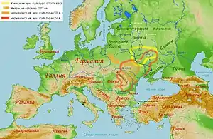 The Kyiv culture or Kiev culture is an archaeological culture dating from about the 3rd to 5th centuries, named after Kyiv, the capital of Ukraine. It is widely considered to be the first identifiable Slavic archaeological culture.[1] It was located in the "middle and upper Dnieper basin, akin to it sites of the type Zaozer´e in the upper Dnieper and the upper Dvina basins, and finally the groups of sites of the type Cherepyn–Teremtsy in the upper Dniester basin and of the type Ostrov in the Pripyat basin, in Ukraine and Belarus.[1] It was contemporaneous to (and located mostly just to the north of) the Chernyakhov culture.