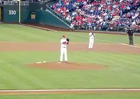 The Phillies acquired Roy Halladay prior to the 2010 season, and during spring training, Kendrick sought the mentorship of Halladay, whom he aspired to emulate during his high school career. Halladay willingly obliged, and teammates endearingly referred to Kendrick as "Little Roy" due to the amount of time he spent working with Halladay.[2] Despite initially losing a competition for the fifth spot in the Phillies starting rotation during spring training to Jamie Moyer, an injury to Joe Blanton thrust Kendrick into the fifth spot in the Phillies rotation, the fourth consecutive year during which he had held that role for at least a short time.[12] After a decent first half of the 2010 season (at the end of June, he had a 4–4 record with a 3.23 ERA).[13] Kendrick was briefly demoted to the Lehigh Valley IronPigs (AAA), but did not make any starts there, as Moyer's season ended due to injury, causing Kendrick's recall.[7] Overall, he earned 11 wins, which tied a career high, and started 31 games, which set a new career high, while, in total, posting an 11–10 record with a 4.73 ERA in 18023 innings pitched.[1] Pat Gallen, editor in chief of Phillies Nation, opined that Kendrick's performance indicated he would never exceed being an average, "run-of-the-mill starting pitcher", who would never exceed that role.[12] At the conclusion of the season, Kendrick and the Phillies avoided salary arbitration by agreeing to a one-year, US$2,450,000 contract.[14]