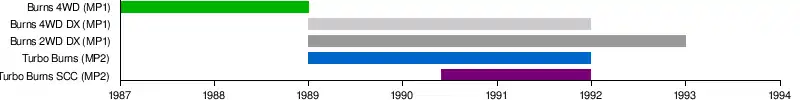 It is often not realized that the "MP" nomenclature which is synonymous with Kyosho buggies from MP5 onward, was already in use at Kyosho for the Burns Series. Burns MP1, Turbo Burns MP2, Inferno MP3, Turbo Inferno MP4.[1]
