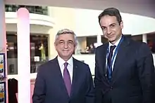 Kyriakos Mitsotakis (Greek: Κυριάκος Μητσοτάκης, Kyriákos Mitsotákis [ciɾˈʝako̞s̠ mit͡so̞ˈtacis̠]; born 4 March 1968) is a Greek politician who has been prime minister of Greece since June 2023 and before from July 2019 to May 2023. He is president of the New Democracy party since 2016. On 26 June 2023, Mitsotakis won a second term as prime minister after winning the June 2023 Greek legislative election.[1] Mitsotakis previously was Leader of the Opposition from 2016 to 2019, and Minister of Administrative Reform from 2013 to 2015. He is the son of the late Konstantinos Mitsotakis, who was Prime Minister of Greece from 1990 to 1993. He was first elected to the Hellenic Parliament for the Athens B constituency in 2004. After New Democracy suffered two election defeats in 2015, he was elected the party's leader in January 2016. Three years later, he led his party to a majority in the 2019 Greek legislative election.