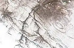 ![]() Northern slopes of the Karatau Range in the winter with the gorges of rivers Shabakty and Kyrshabakty and their confluence at the top. | |