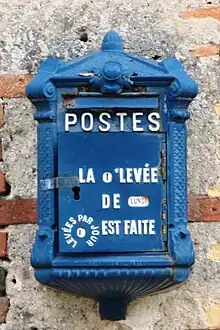 When Mougeot took office most letter boxes were of wood reinforced with iron, and dated to 1830. On 31 July 1899 Mougeot signed a decree to place a new type of cast-iron letter box into general usage, made by Delachanal of Paris. Nicknamed "mougeottes", they had three small windows that let the users see the day, the planned number of pick-ups and the last pick-up that had been made.[4] Two variants were made, one wall-mounted and the other on an iron column fixed to the sidewalk. The "mougeottes" were introduced experimentally at first, but proved very popular and were soon installed throughout France. At first bronze-green in color, from 1905 they were painted blue.[4]