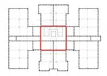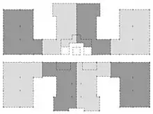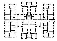 As per Havana zoning laws, the ground floor was required to have a porch facing 13th Street. It also had to provide public, commercial establishments. To this end, the building had various stores, a barbershop, restaurants and coffee shops. The distribution of the upper floors is as follows: from the second to the tenth floor, the building has eight apartments per floor, six with a separate service entrance opening directly into the kitchen and service area. Each apartment has access from the kitchen to what is called in Havana a "patio" (dark blue), this is an area equipped with a sink for doing laundry.[9] A similar room labeled a patio can also be found in other modernist buildings such as the FOCSA Building of 1956 and the apartments at the Edificio del Seguro Médico of 1958 on La Rampa. The four apartments in the center have two bedrooms each. The east and west apartments have three bedrooms each and an extra small maid's bedroom located next to the kitchen with a toilet and a shower. Each apartment has a small bathroom with a window close to the bedrooms. The main entrance door to the apartment opens directly into the living room. Only the apartments in the center block have a short corridor connecting the bedrooms. This shortage of corridors in the design mandates that the circulation occurs mostly through the rooms thus decreasing their effective square footage. The dining room is connected to the kitchen and the patio. The center apartments on the south side have a smaller entry vestibule. Every apartment was originally provided with modern amenities: hot and cold water, gas, radio, and telephone service. The López Serrano Building was the country's first co-operative apartment corporation.[10]