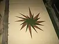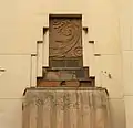 The exterior walls are brick with one inch, integral color cement plaster finish. There are raised plaster ornaments on the exterior walls and inscribed lines in the plaster suggesting a masonry bond in the lower part of the wall. There are also terracotta design panels inserted over some of the openings. All the windows and doors of the building are wood and glass in a wood frame. The floor of the apartments are covered with tiles with red and green geometric designs, there are tile baseboards. The interior walls are terracotta tile and covered in cement plaster. The floor of the lobby, the porch, and entrances to the building have ornate designs in red and black or red and green terrazzo. The walls of the lobby are Moroccan, book matched, red marble panels.[8] There is a nickel-silver relief El Tiempo (‘Time’) by graphic designer Enrique García Cabrera on the elevator wall of the lobby.[1] The elevator doors are pivot hinged and originally were nickel silver with various Art Deco designs.