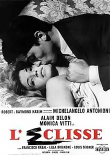 L'Eclisse (English: "The Eclipse") is a 1962 Italian romance film written and directed by Michelangelo Antonioni and starring Alain Delon and Monica Vitti. Filmed on location in Rome and Verona, the story follows a young woman (Vitti) who pursues an affair with a confident young stockbroker (Delon). Antonioni attributed some of his inspiration for L'Eclisse to when he filmed a solar eclipse in Florence.[1] The film is considered the last part of a trilogy and is preceded by L'Avventura (1960) and La Notte (1961).[2][3][4]