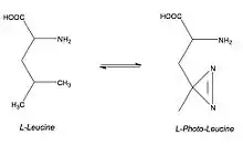 l-Photo-leucine resembles l-leucine in its structure. However, the latter contains a photo-activatable diazirine ring, which the former does not, and which yields a reactive carbene after the light-induced loss of nitrogen, fact that confers l-photo-leucine its properties. This photo-reactive amino acid is synthesized by α-bromination of the azi-carboxylic acid followed by aminolysis of azi-bromo-carboxylic acid.